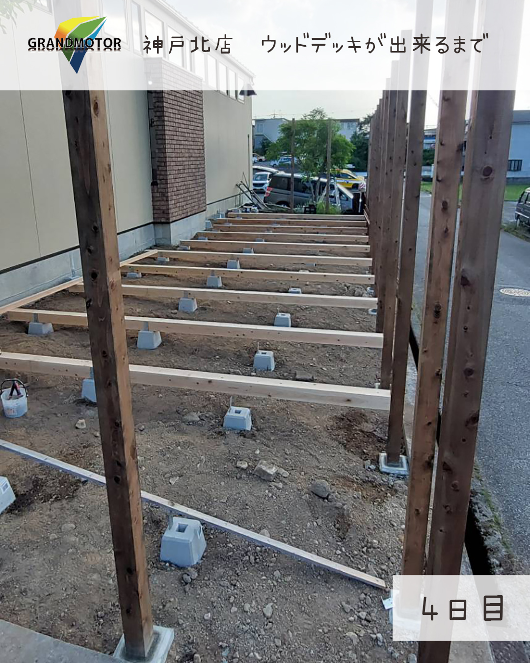 2024/06/22 グランドモーター神戸北店のウッドデッキが完成するまで~4日目~ 目隠しフェンス用の柱を1日目に埋めた基礎ブロックに立てて行きます! 間隔にバラツキが無いように柱を立て隙間にモルタルを流して固定します。 横から見た時に完全にキレイな一直線になる様にします!! これがキレイでないと完成が雑になってしまいます。 柱が全て立て終わったら大引き(横の角材)を柱に固定し束石に乗せて行きます。 この時もしっかり水平の確認を全部の大引きで行います。 店舗情報 ブログ一覧に戻る